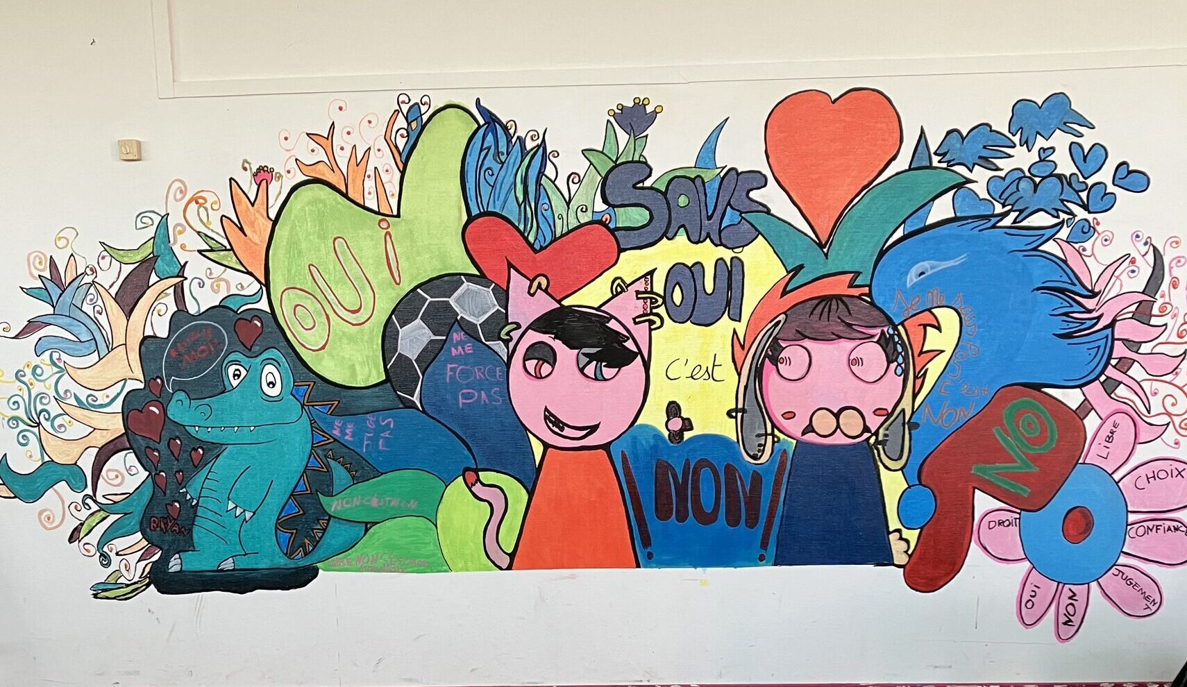 Ce temps de création partagé a permis d’exprimer, à travers l’art, les valeurs essentielles liées au respect, à l’écoute et au consentement. La fresque est aujourd’hui le reflet d’un travail collectif, riche en échanges et en créativité.