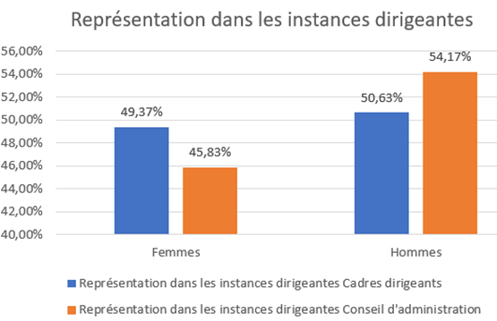 - Proportion hommes-femmes parmi les cadres dirigeants et le conseil d’administration. Le total des indicateurs calculables est ramené sur 100 points en appliquant la règle de la proportionnalité.